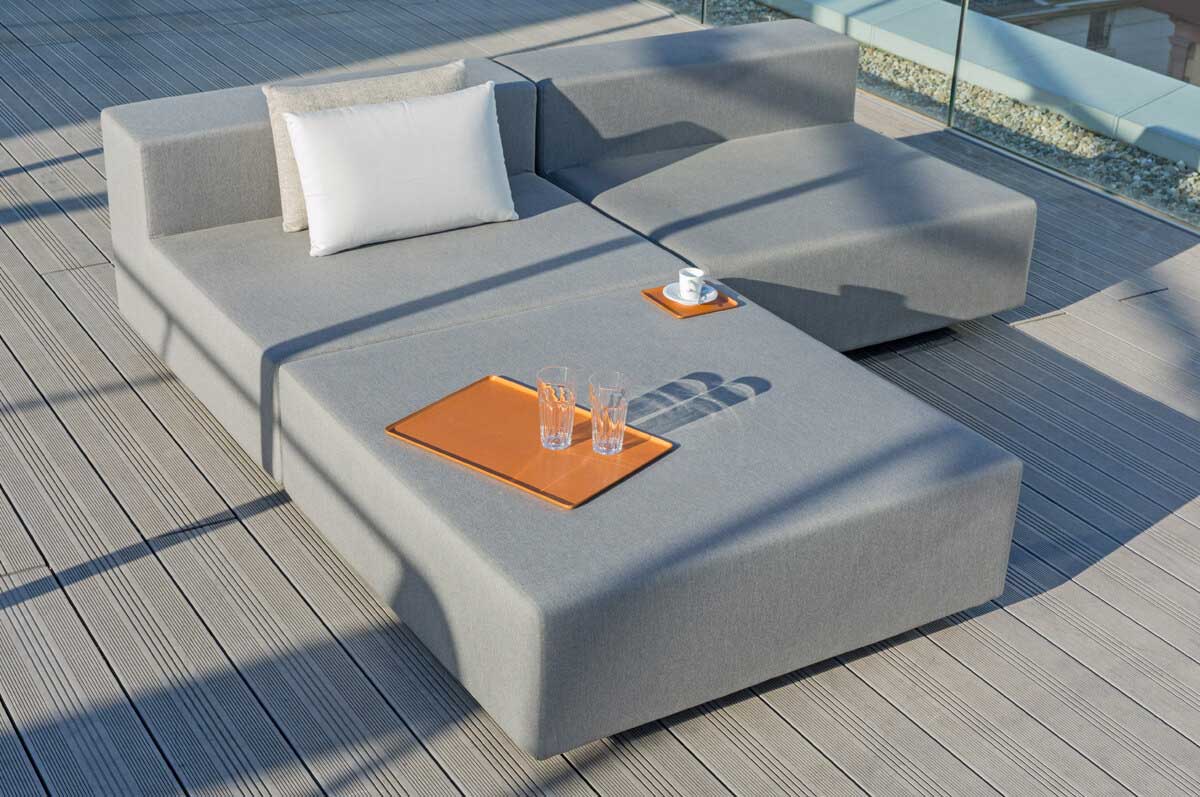 Ein Loungehocker wird im Handumdrehen zur Ablage, zwei Sessel verwandeln sich in ein kompaktes Outdoor-Sofa.