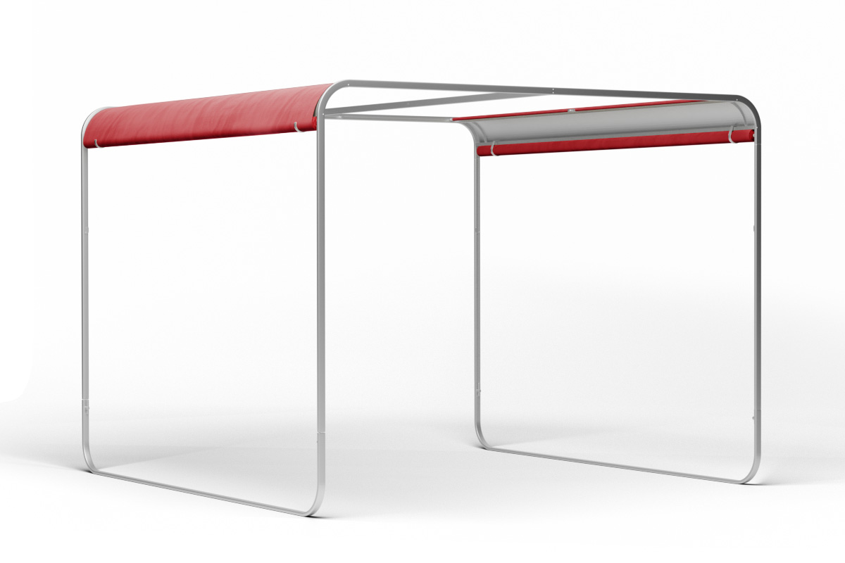 Das Sonnendach SHANGRILA hat aufgrund seinen am Boden verlaufenden Kufen im Vergleich zum klassischen Sonnenschirm einen stabilen Stand. Die beiden Stoffbahnen werden im Gestell geführt, jedoch nicht permanent fixiert. Sie können sich daher bei aufkommendem Wind bewegen so dass nicht die gesamte Kraft des Windes auf das Gestell übertragen wird.