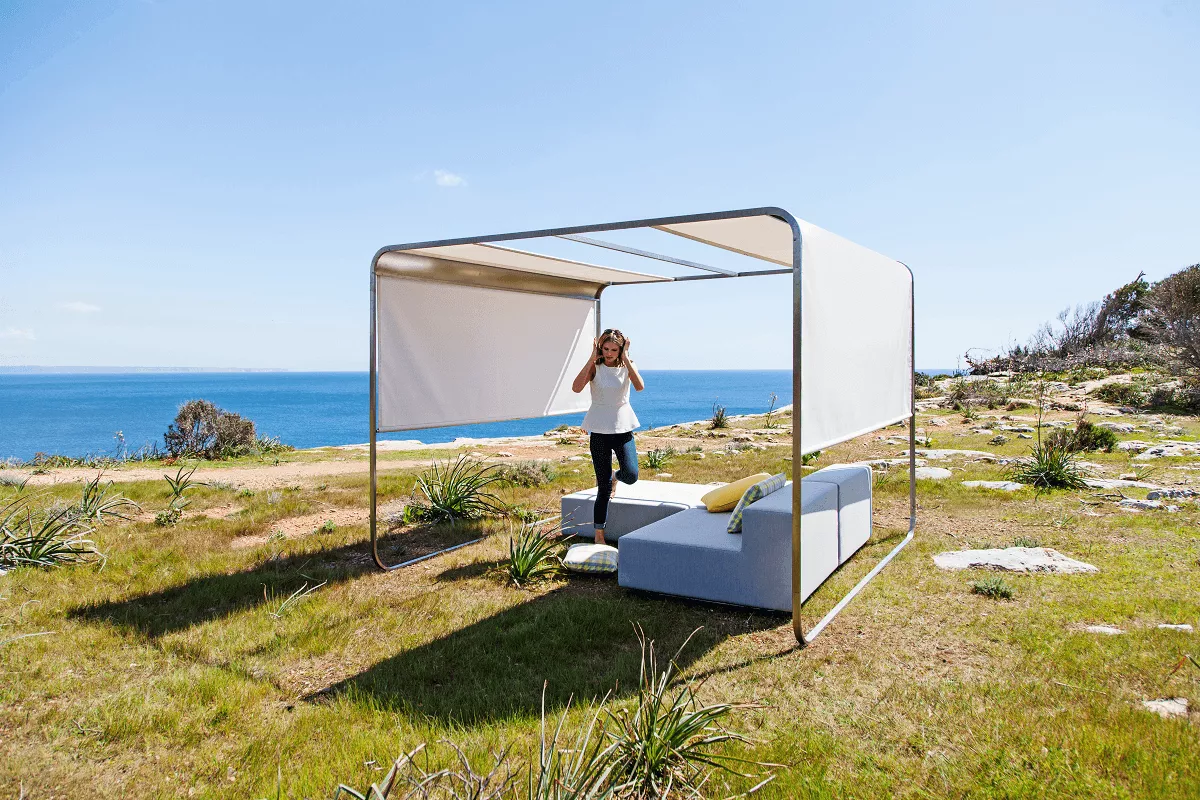 Das prämierte Design Sonnensegel verfügt über 2 Stoffbahnen, die unabhängig voneinander manuell verstellt werden können und so einen flexiblen Sonnenschutz bieten. Dadurch, dass die Bahnen auch seitlich heruntergezogen werden können, bietet das Segel sogar einen Schutz vor seitlichen Blicken oder Seitenwind.
