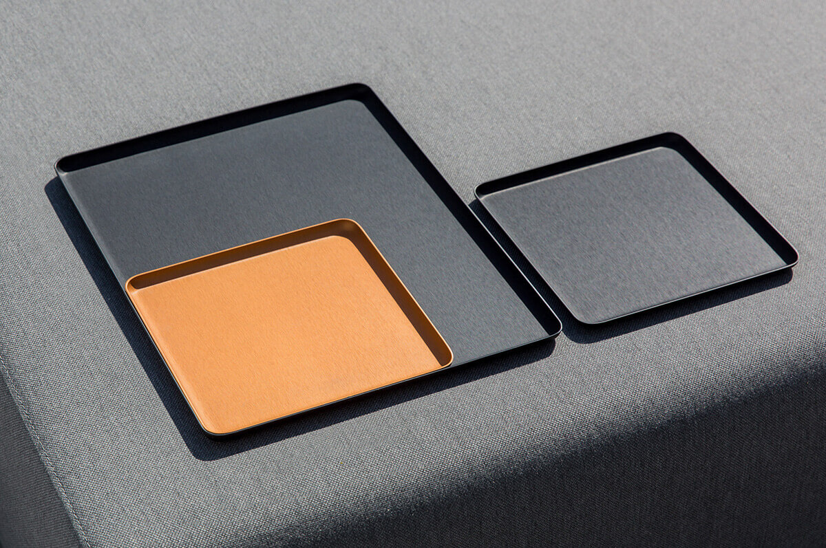 Es gibt zwei rechteckige und ein quadratisches Tablett JEEVES. Bei allen Tabletts können Sie aus vier verschiedenen Farben wählen: Aluminium, Kupfer, Messing oder Schwarz.