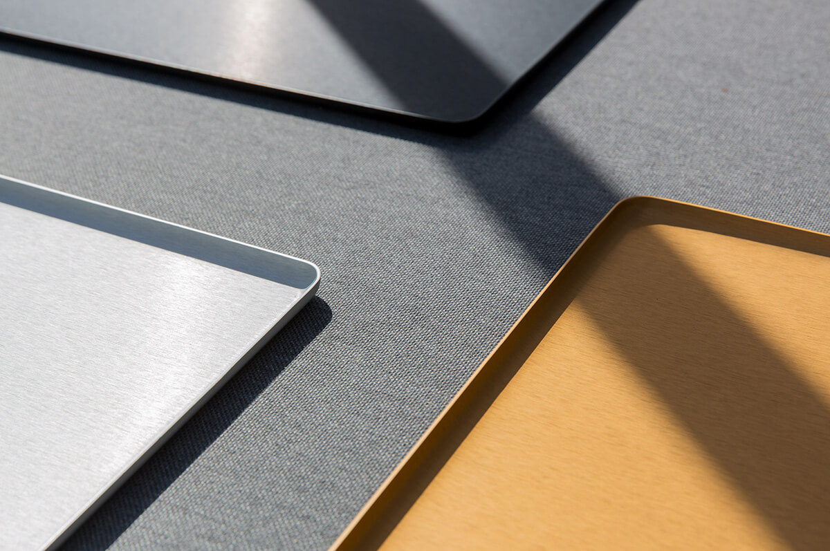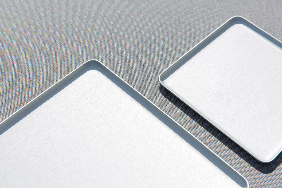 Das Tablett JEEVES wird aus Aluminium hergestellt. Dabei wird das Alumnium über ein Werkzeug gepresst, so daß es seine Form erhält. Zunächst wird die Oberfläche gebürstet. Dann wird die Oberfläche galvanisiert. Bei der Galvanisierung wird die Farbe gut am Material fixiert. Das Ergebnis ist eine relativ kratzfeste Oberfläche des Tabletts. Gläser und Teller hinterlassen nur wenige Spuren.