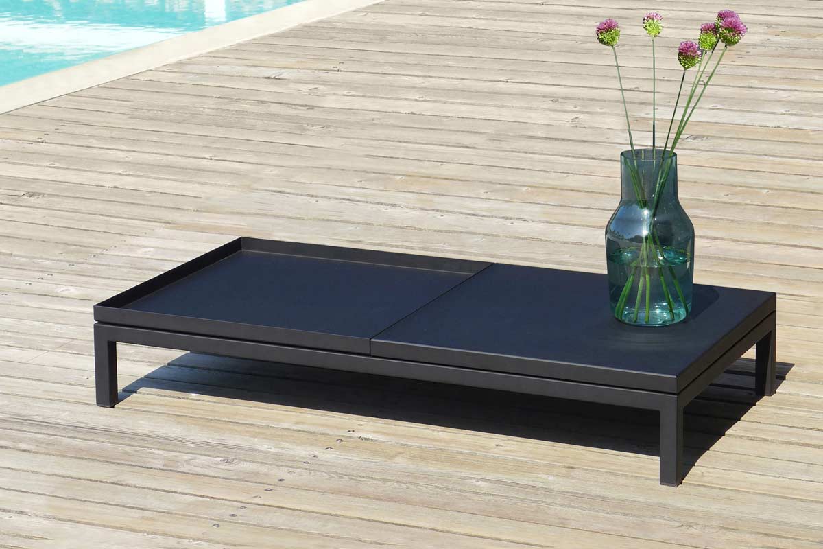Nach dem Design-Prinzip „form follows function“ verbindet der hochwertige Outdoor Tisch modernes Design mit überzeugender Funktionalität. Sehr praktisch: Die Tablett-förmigen Tischplatten aus Edelstahl sind magnetisch und dadurch abnehmbar.